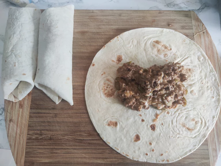 Im Airfryer bei 200 °C ca. 8–10 Minuten goldbraun backen – fertig sind deine Cheeseburger-Wraps!