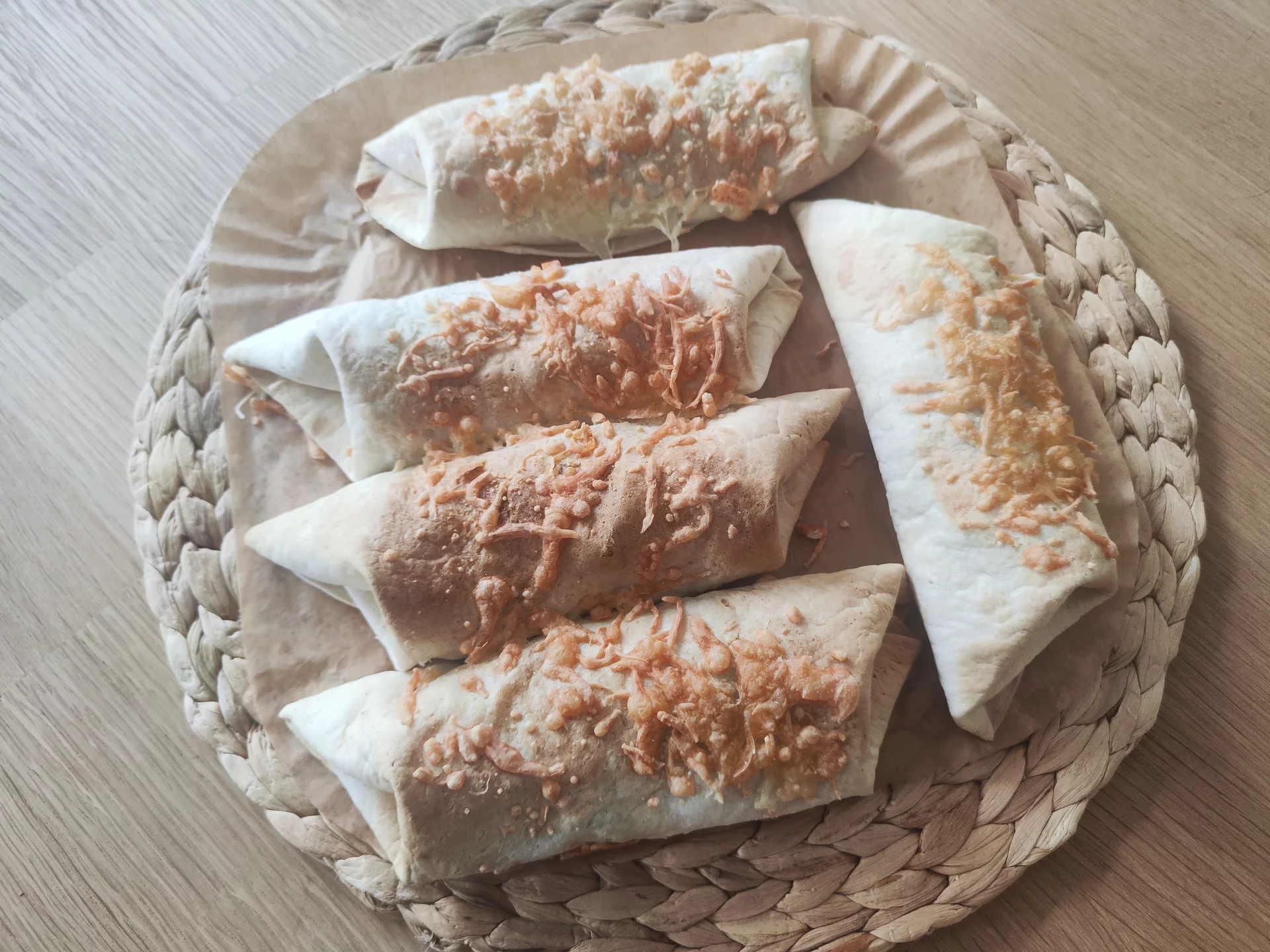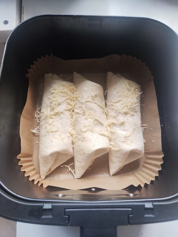 Die fertigen Wraps auf ein mit Backpapier belegtes Blech oder in den Airfryer legen, mit 1–2 Sprühstößen Öl besprühen und etwas zusätzlichen Käse darüberstreuen.
