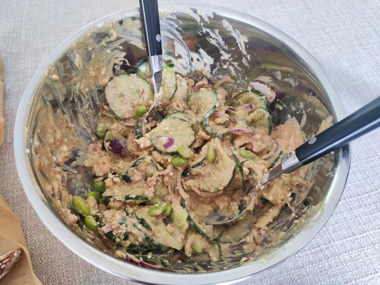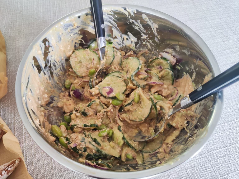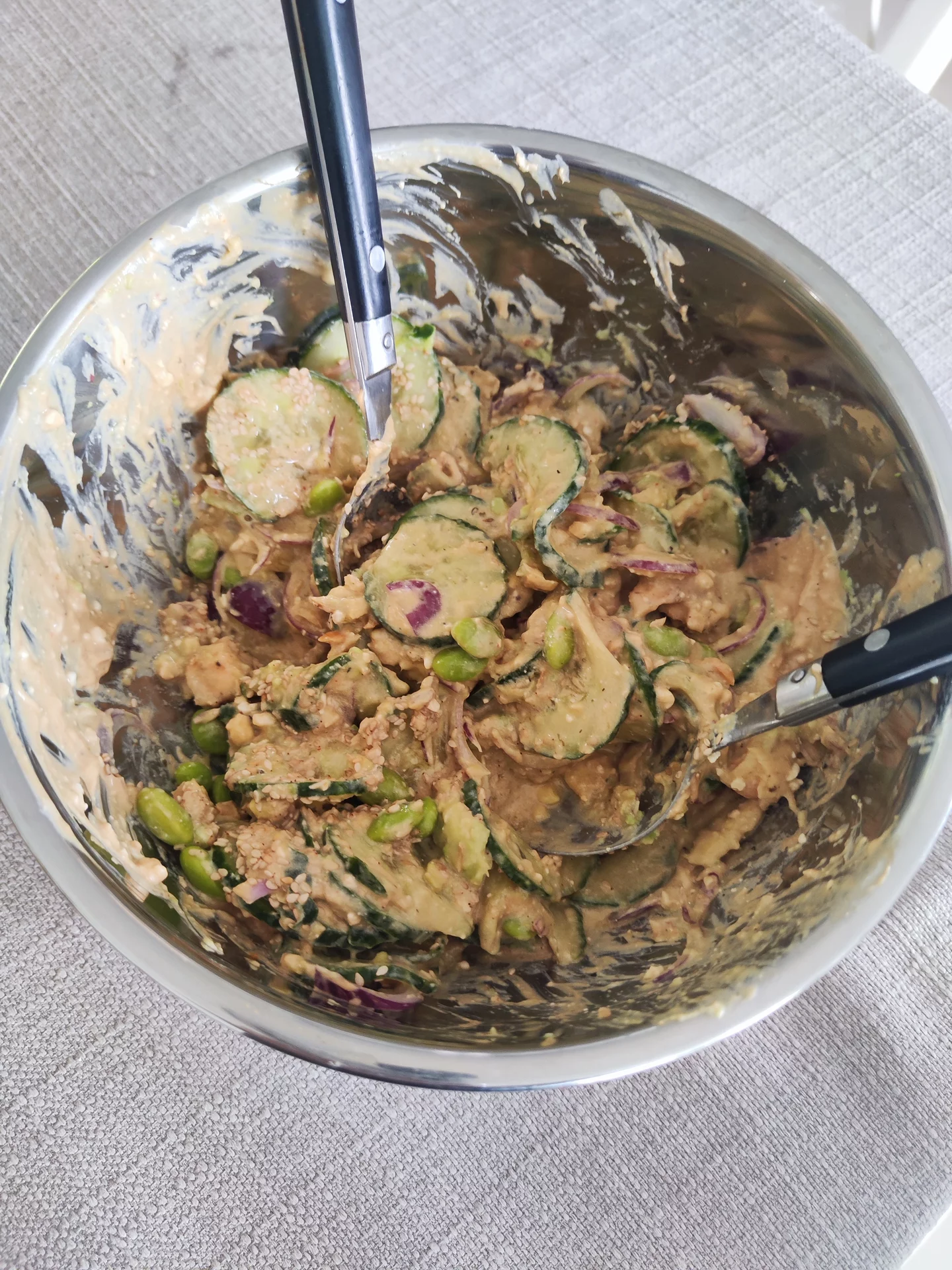 Die Salatgurke in dünne Scheiben oder kleine Würfel schneiden.