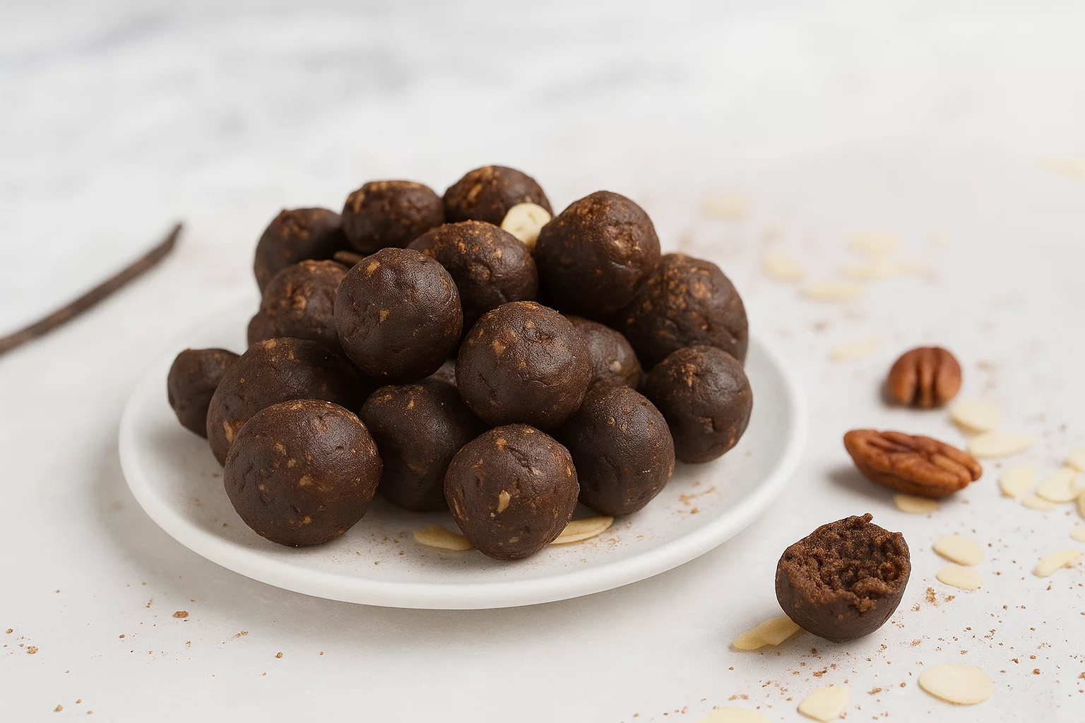Die fertigen Bällchen für ca. 60 Minuten im Kühlschrank kaltstellen, damit sie fest werden. Wenn es schneller gehen soll, einfach für ein paar Minuten in den Gefrierschrank legen.